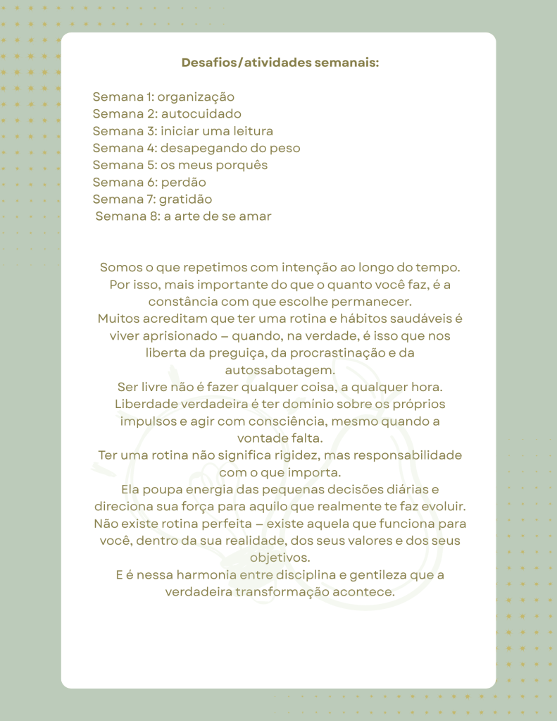 Você ganha um planner para acompanhar sua evolução durante as semanas do protocolo, com desafios/tarefas e espaço para preencher como foi o seu dia.